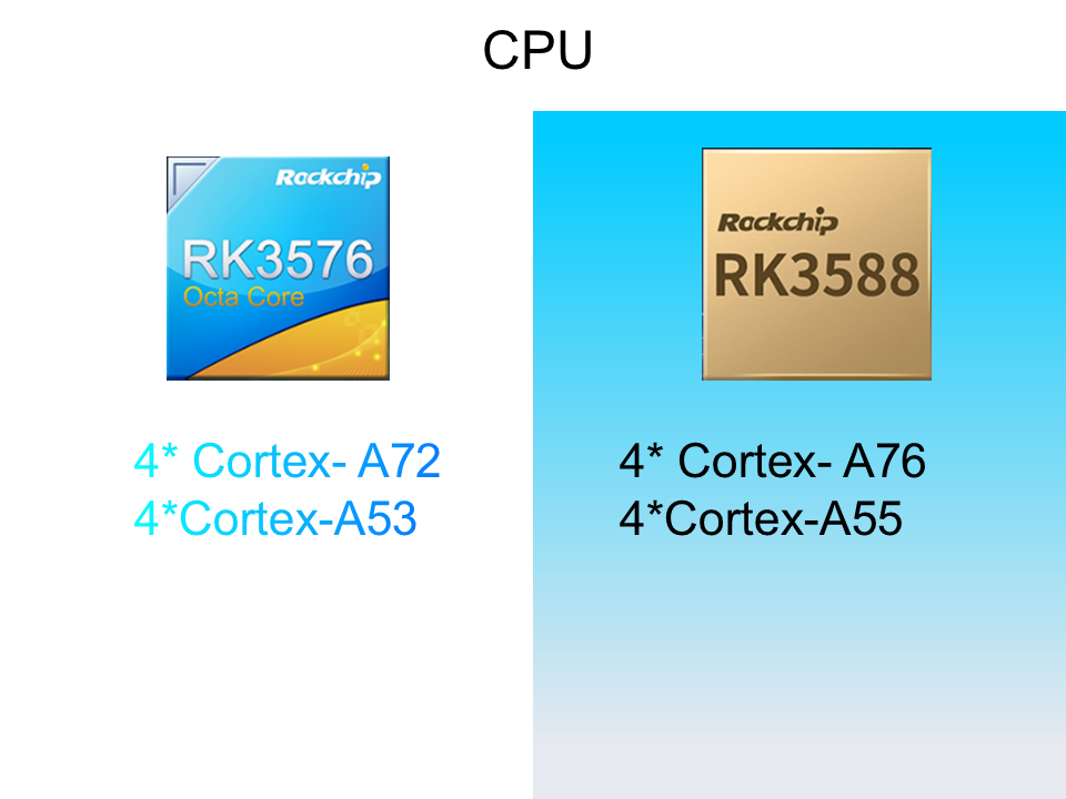 CPU-ydeevne: RK3588 bruger quad-core cortex-A76 + quad-core cortex-A55, mens RK3576 bruger quad-core cortexa72 + quad-core cortex-A53 arkitektur til omkostningsovervejelser og er udstyret med arm cortex M0 coprocessor, hvilket bringer flere muligheder for relaterede anvendelser.