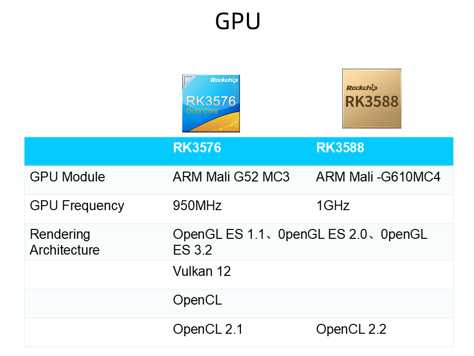 De understøtter begge OpenGL ES 1.1, 2.0 og 3.2, Vulkan 1.2, men RK3588 er højere i OpenCL -versionen (RK3588 understøtter 2.2).