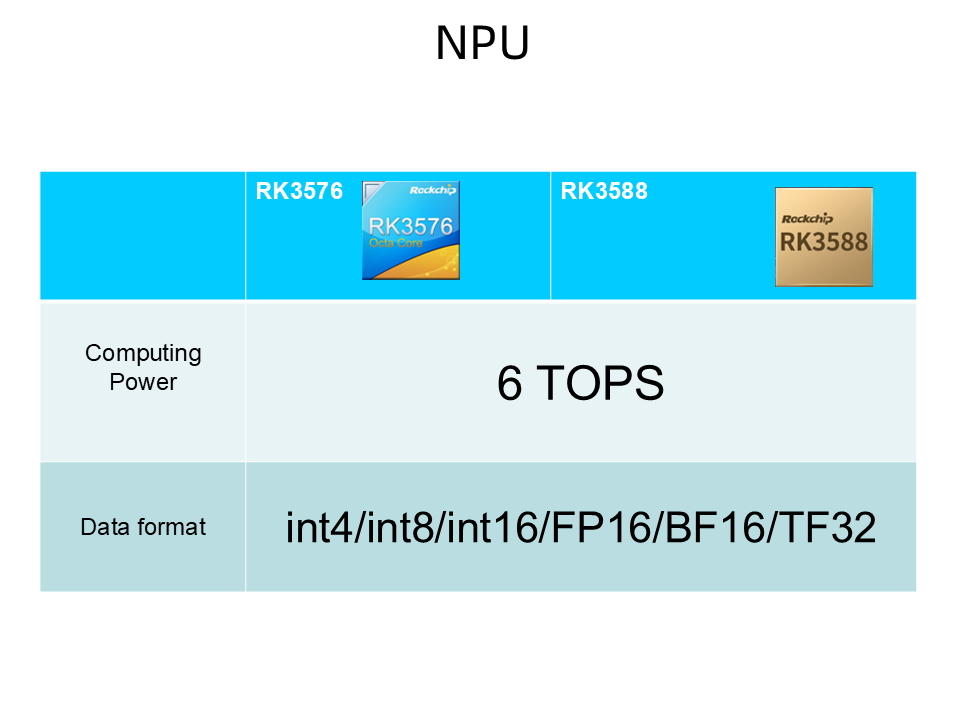 RK3588 og RK3576 er udstyret med 6TOPS Computing Power, Support Data Formats såsom INT4INT8/INT16/FP16/BF16/TF32 og er egnede til en række AI -applikation scenarier.