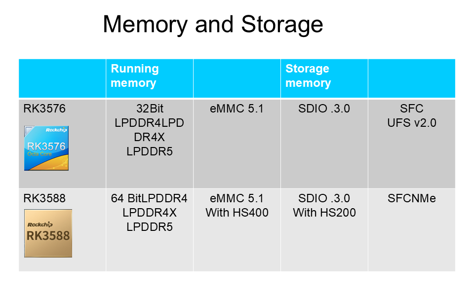 RK3588 understøtter64-bitLPDDR4/LPDDR4X/LPDDR5, EMMC5.1: Med HS400, SDI03.0 med HS200 og NME og SFC. De to er forskellige i hukommelsesdata bitbredde (64bit vs. 32bit).