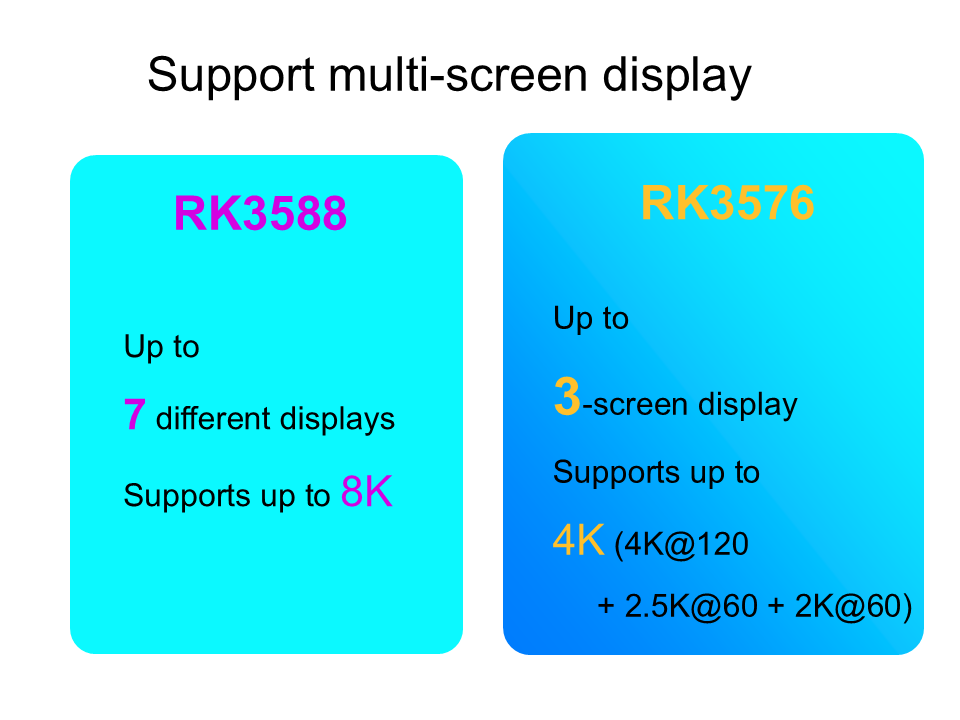 Både RK3588 og RK3576 understøtter flere skærme og forskellige almindelige skærmgrænseflader.