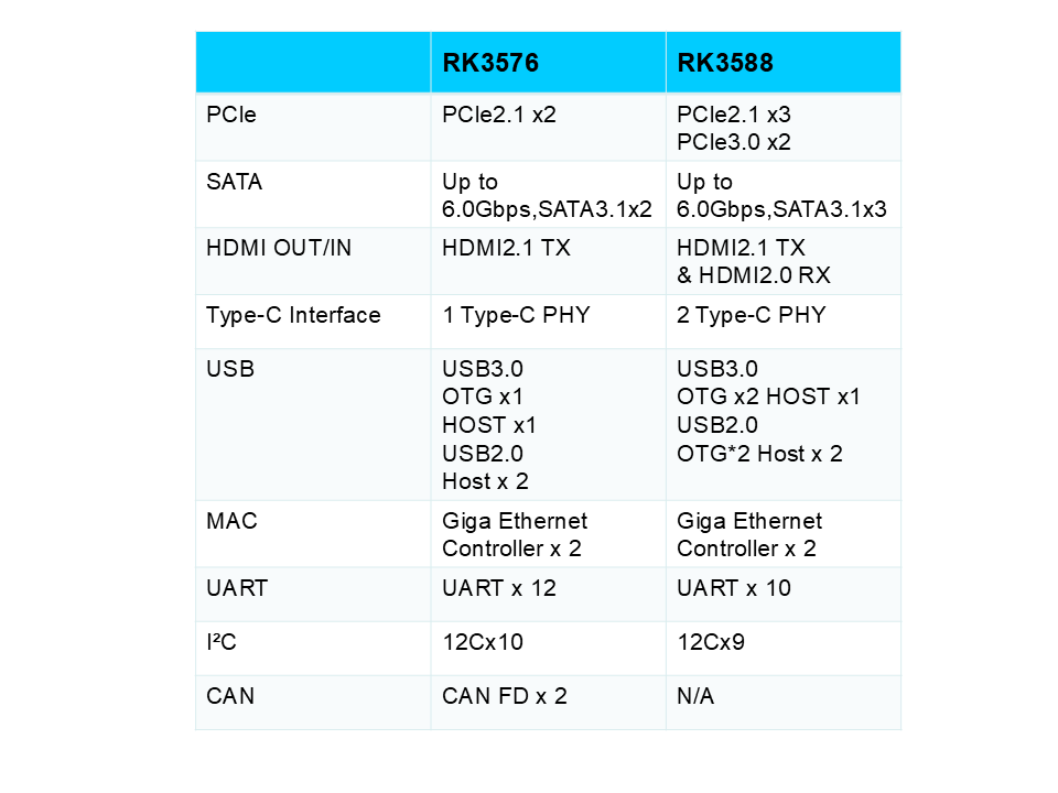 Både RK3588 og RK3576er udstyret med rige interface -konfigurationer, herunder PCIe/ SATA/ type C/ USB3.0/ USB2.0/ Dual Network Ports/ Multiple Serial Ports for at imødekomme forskellige produktapplikationskrav.